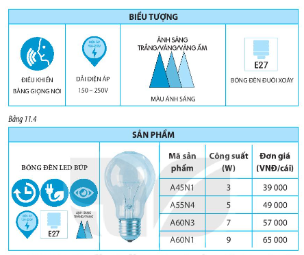 Hãy đọc thông tin sản phẩm (Catalog) trong Bảng 11.3 của một nhà sản xuất bóng đèn và cho biết các thông tin về bóng đèn LED búp có mã A55N4 (bảng 11.4)