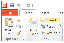 b) Chọn lệnh Layout và quan sát các mẫu bố trí có thể áp dụng cho các trang chiếu đã có. Lần lượt nháy chọn các mẫu bố trí khác nhau, quan sát và ghi nhận những thay đổi trên trang chiếu được hiển thị trên khu vực chính của màn hình.