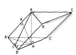 Mặt khác, AH ⊥ B’C’ nên AA’ ⊥ B’C’. Kẻ đường cao HK của tam giác AA’H thì HK chính là khoảng cách giữa AA’ và B’C’. Do AA’.HK = AH.A’H nên \(HK = {{{a \over 2}.{{a\sqrt 3 } \over 2}} \over a} = {{a\sqrt 3 } \over 4}\)