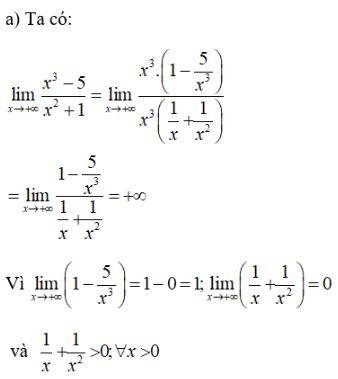 & \text{vì}\,\mathop {\lim }\limits_{x \to + \infty } x = + \infty \,\text{và}\,\mathop {\lim }\limits_{x \to + \infty } {{1 – {5 \over {{x^3}}}} \over {1 + {1 \over {{x^2}}}}} = 1 > 0 \cr} \)