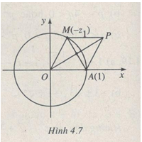 Nếu \({z_1} \ne 1\) thì \(1 – {z_1} \ne 0\), điểm P biểu diễn số \(1 + \left( { – {z_1}} \right) = {z_2} + {z_3}\) không trùng với O nên do \(1 = \left| { – {z_1}} \right| = \left| {{z_2}} \right| = \left| {{z_3}} \right|\), đường trung trực OP cắt đường tròn đơn vị tại hai điểm biểu diễn \(1, – {z_1}\) và cũng là hai điểm biểu diễn \({z_2},{z_3}\) (h.4.7). Vậy \({z_2} = 1,{z_3} =  – {z_1}\) hoặc \({z_2} =  – {z_1},{z_3} = 1\). Tóm lại hoặc \({z_1} = 1\) hoặc \({z_2} = 1\) hoặc \({z_3} = 1\) và tổng hai số z còn lại bằng 0