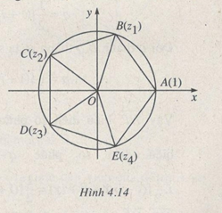 Trong mặt phẳng phức xét ngũ giác đều ABCDE nội tiếp đường tròn đơn vị. A là điểm biểu diễn số 1 (giả sử đi dọc chu vi đa giác theo ngược chiều kim đồng hồ gặp các đỉnh kế tiếp B, C, D, E). Kí hiệu \({z_1},{z_2},{z_3},{z_4}\) là các số phức theo thứ tự biểu diễn bởi các điểm B, C, D, E.