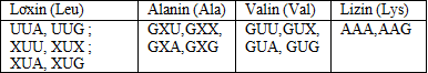 Trình tự axit amin trong prôtêin: – lơxin – alanin – valin – lizin