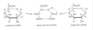 c,Trong dung dịch Glucozơ chủ yếu tồn tại ở vòng 6 cạnh\((\alpha ,\beta )\) .Hai dạng này luôn chuyển hóa lẫn nhau theo 1 cân bằng qua dạng mạch hở.