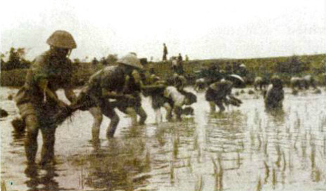 – Ghi chú cho hình ảnh: Các chiến sĩ bộ đội tham gia giúp dân cấy lúa trong kháng chiến chống Pháp.