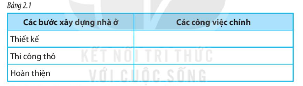 Hãy sắp xếp các công việc dưới đây vào Bảng 2.1 sao cho phù hợp với từng bước xây dựng nhà ở