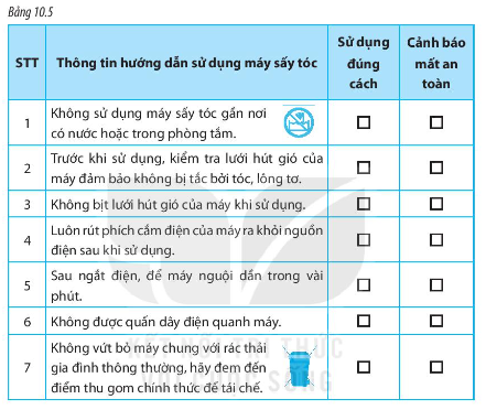 Hãy đọc thông tin hướng dẫn sử dụng máy sấy tóc trong Bảng 10.5, điền dấu ✔ vào các ô tương ứng với thông tin hướng dẫn sử dụng đúng cách, thông tin cảnh báo mất an toàn.