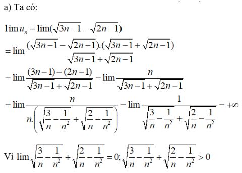 & \text{ vì }\,\lim \sqrt n = + \infty \cr &\text{ và }\,\lim {{1} \over {\sqrt {3 – {1 \over n}} + \sqrt {2 – {1 \over n}} }} \cr & = {{1} \over {\sqrt 3 + \sqrt 2}} > 0 \cr} \)