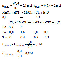 Cho 69,6 gam MnO2 tác dụng với dung dịch HCl đặc dư thu được một lượng khí X. Dần khí X vào 500 ml dung dịch NaOH 4M thu được dung dịch A. Tính nồng độ mol của các chất trong dung dịch A. Giả thiết rằng thể tích dung dịch sau phản ứng thay đổi không đáng kể.