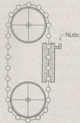 Không hoạt động được. Chỗ sai là không phải chi có lực đẩy Ác-si-mét đẩy các quả nặng lên. Khi một quả nặng từ dưới đi lên, trước lúc đi vào thùng nước, bị nước từ trên đẩy xuống. Lực đẩy này tỉ lệ với chiều cao cột nước trong thùng, lớn hơn lực đẩy Ác-si-mét tác dụng lên các quả nặng.