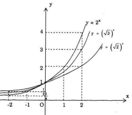 Với x > 0 thì \({2^x} > {(\sqrt 3 )^x} > {(\sqrt 2 )^x}\) nên x > 0 đồ thị y = 2x nằm phía trên đồ thị \(y = {(\sqrt 3 )^x}\) và đồ thị \(y = {(\sqrt 3 )^x}\) nằm phía trên đồ thị \(y = {(\sqrt 2 )^x}\)