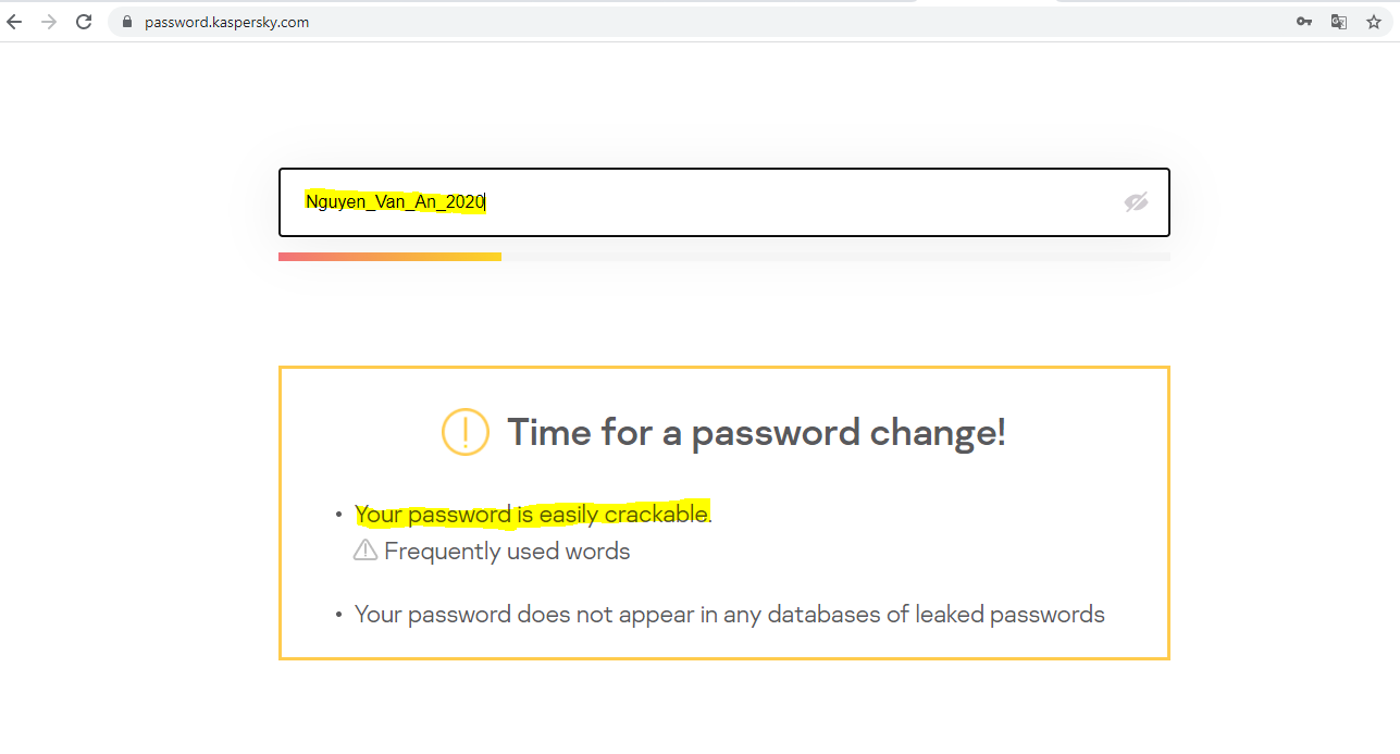1) Khi kiểm tra, những mật khẩu như “an123456”; “Nguyen_Van_An_2020”; “nguyenvanan12345”; “Nguyen_Van_An” đều được thông báo là mật khẩu dễ bị bẻ khóa/quá cũ.