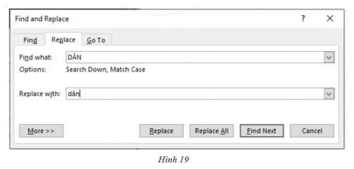 4) Thay tất cả những chỗ có từ “DÂN” thành từ “dân” bằng cách thực hiện lệnh Replace. Nhập từ cần tìm và từ thay thế như trong hình dưới đây. Sau đó, lần lượt nháy các nút lệnh Find Next và Replace để kiểm tra và thay từ “DÂN” thành từ “dân”. (Chú ý, cần nháy chuột vào mục More và đánh dấu v vào ô Match case).