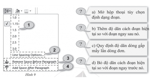 Trong hình sau đây (Hình 9), hãy điền các số 1, 2, 3, 4 vào các ô có dấu “?” để nhận được giải thích đúng về lệnh định dạng tương ứng.