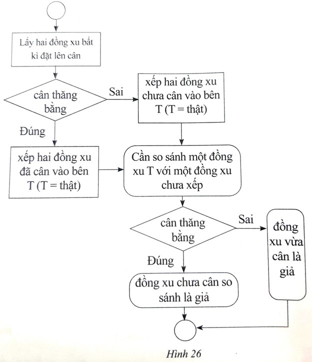 2) Thuật toán: Sử dụng cân thăng bằng tìm đồng xu giả (Hình 26).