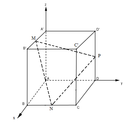 Bước 2: \(\overrightarrow {AC’} = \left( {1;1;1} \right),\overrightarrow {MN} = \left( {{1 \over 2};{1 \over 2}; – 1} \right),\overrightarrow {MP} = \left( { – {1 \over 2};1; – {1 \over 2}} \right).\)