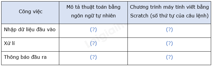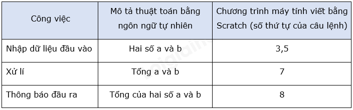 Dựa vào chương trình tính tổng hai số bằng ngôn ngữ tự nhiên và chương trình Scratch ở Hình 6.13, em hãy bổ sung nội dung vào các dấu hỏi chấm trong bảng sau: