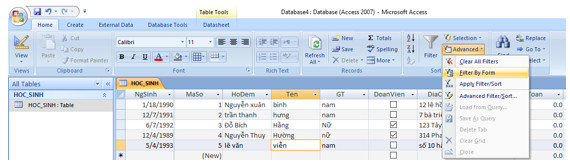 – Trong hộp thoại Filter by Form , nhập điều kiện lọc: nhập “Nữ” trong cột GT và nhập ># 01/09/1991# trong cột NgSinh.