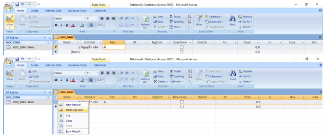 + Xóa (Delete) bản ghi hiện thời: Nháy nút (>x);