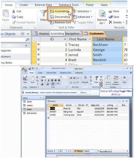 – Sắp xếp và lọc dữ liệu: sắp tăng, giảm theo trường (ở chế độ hiển thị trang dữ liệu của bảng), lọc ra các bản ghi thỏa mãn một số điều kiện (có hai cách: lọc theo ô dữ liệu đang chọn, lọc theo mẫu).
