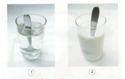 Em hãy quan sát hai bức tranh để phát hiện đâu là cốc đựng nước, đâu là cốc đựng sữa. Cốc đựng nước thì nước bên trong như thế nào?
