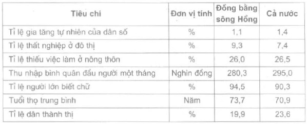 Bảng 20.1. Một số tiêu chí phát triển dân cư, xã hội ở Đồng bằng sông Hồng và cả nước, năm 1999