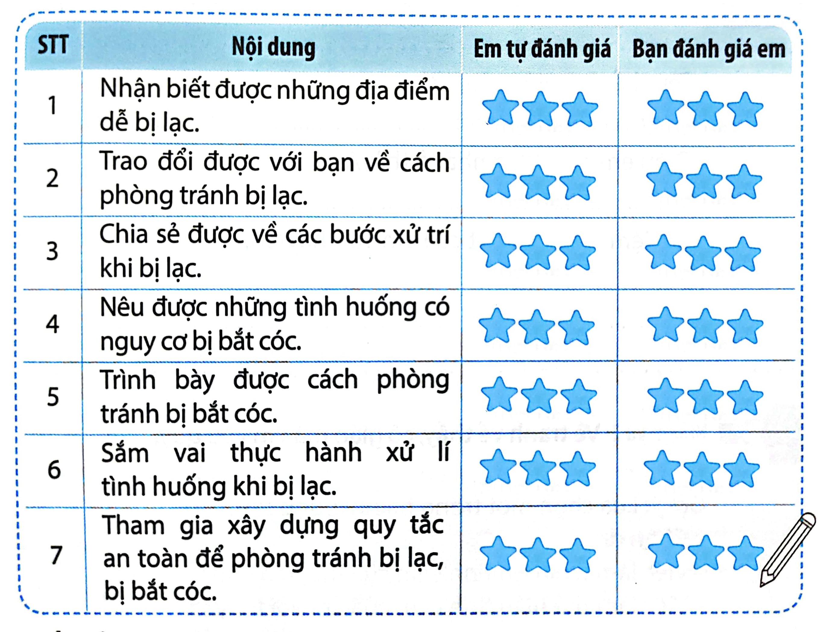 – Đầu tiên em đọc nội dung của bảng đánh giá, thông qua những lần tham gia hoạt động, em thấy mình đã hoàn thành tốt những yêu cầu của bảng đưa ra chưa? Tự mình đánh giá mức độ hoàn thành của bản thân.