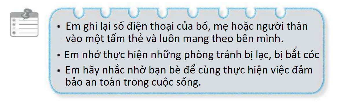 Tôi rất vui vì nhờ chủ đề lần này mà con đã biết cách phòng tránh các nguy cơ bị bắt cóc, bị lạc. Ngoài ra, con còn biết cách xử trí khi mình bị lạc nữa. Mặc dù ở nhà con đã được bố mẹ cảnh báo, dặn dò rất nhiều nhưng đến chủ đề này con mới thực sự hiểu được tính nghiêm trọng khi bản thân không biết cách phòng tránh các nguy cơ bị bắt cóc, bị lạc. Qua chủ đề lần này, con đã cảnh giác và cẩn trọng hơn trước. Con tự giác ghi lại số điện thoại của bố, mẹ và luôn mang theo một chiếc còi để thổi khi gặp nguy hiểm.