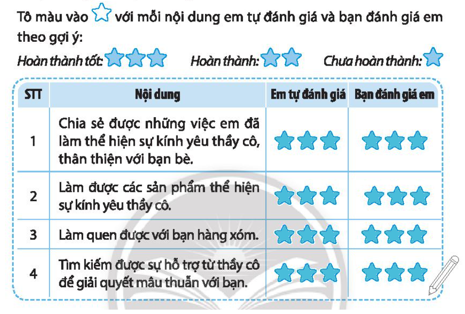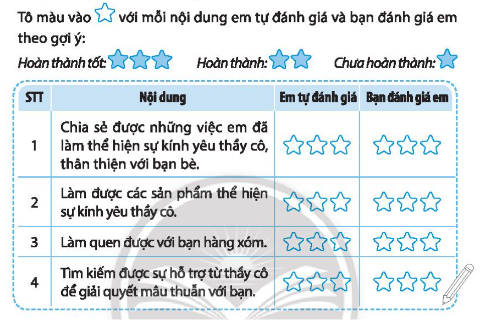 Tô 1 sao nếu em chưa hoàn thành, tô 2 sao nếu e đã làm, tô 3 sao nếu em hoàn thành tốt việc đó.
