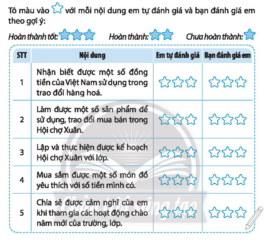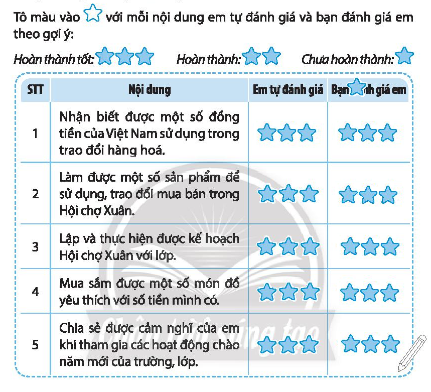 – Sau đó, em nhờ bạn đánh giá thông qua những ghi chép của em trong vở bài tập và tô màu vào bảng.