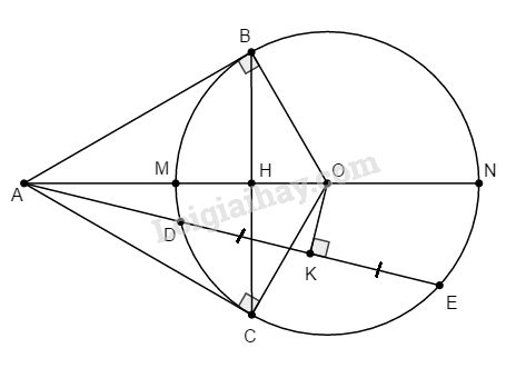 Do đó ∆AKO vuông tại K có OA là cạnh huyền, lại có các tam giác ABO, ACO vuông cũng có OA là cạnh huyền. Vì vậy năm điểm A, B, O, K, C thuộc cùng một đường tròn có đường kính OA.