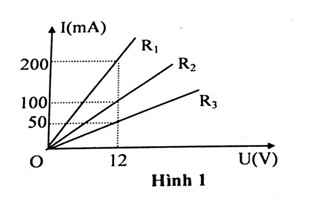 Câu 3.Trên hình 1 là đồ thị biểu diễn sự phụ thuộc của cường độ dòng điện và hiệu điện thế đối với 1 dây dẫn khác nhau. Dựa vào đồ thị cho biết điện trở R1, R2, R3 có giá trị là: