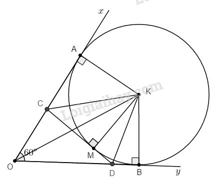 Cho góc \(\widehat {xOy} = 60^\circ .\) Đường tròn tâm K bán kính R tiếp xúc với Ox tại A và Oy tại B. Từ điểm M trên cung nhỏ AB, vẽ tiếp tuyến với đường tròn, tiếp tuyến này cắt Ox, Oy lần lượt tại C và D.