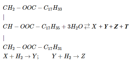 \(\eqalign{& C{H_2} – OOC – {C_{17}}{H_{33}}  \cr & |  \cr & CH – OOC – {C_{17}}{H_{33}}  \cr & |  \cr & C{H_2} – OOC – {C_{17}}{H_{31}} \cr} \)