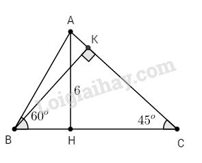 b. Kẻ đường cao AH của tam giác ABC. Biết \(\widehat B = 60^\circ ,\,\widehat C = 45^\circ ,\) đường cao \(AH = 6cm\). Tính \({S_{ABC}}\)