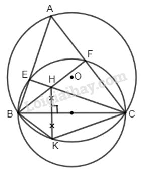 Tam giác ABC có ba góc nhọn nội tiếp trong đường tròn (O). Đường tròn đường kính BC cắt AB, AC lần lượt tại E và F. BF, CE cắt nhau tại H.