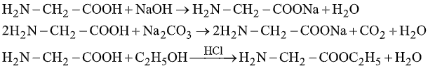 Glyxin có chức axit –COOH nên tác dụng được với bazơ NaOH, dung dịch muối của axit dễ bay hơi \(N{a_2}C{O_3}\) và phản ứng este hóa với ancol \({C_2}{H_5}OH\)