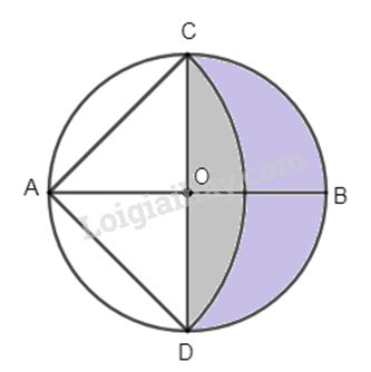 Cho hình tròn (O; R) hai đường kính AB và CD vuông góc với nhau. Dựng cung tròn tâm A bán kính AC. Tính diện tích hình quạt ACD và hình “ trăng khuyết” ( tô đậm).