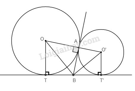 Cho đường tròn (O; R) và (O’; R’) tiếp xúc ngoài nhau tại A. Một tiếp tuyến chung ngoài TT’ \((T ∈ (O), T’ ∈ (O’))\) cắt tiếp tuyến qua A tại B.
