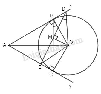 Cho góc \(\widehat {xAy}\) và đường tròn (O) tiếp xúc với Ax và Ay tại B và C. Trên đoạn thẳng BC lấy điểm M ( khác B và C). Đường thẳng vuông góc với OM tại M cắt Ax, Ay lần lượt tại D và E. Chứng minh các điểm A, D, O, E cùng nằm trên một đường tròn.