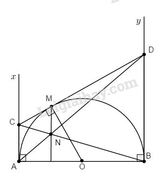 Cho nửa đường tròn tâm O đường kính AB. Trên cùng nửa mặt phẳng có bờ là đường thẳng AB, vẽ các tiếp tuyến Ax, By với (O) (A, B là các tiếp điểm). Qua điểm M thuộc nửa đường tròn kẻ tiếp tuyến thứ ba cắt Ax, By lần lượt tại C và D. Gọi N là giao điểm của AD và BC. Chứng minh: