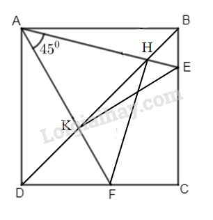 \(\widehat {EAF} = 45^\circ \) . Các đoạn thẳng AE, AF cắt BD theo thứ tự ở H và K. Chứng minh tứ giác EHKF nội tiếp.