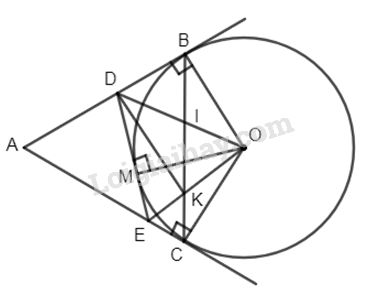 Theo (tính chất hai tiếp tuyến cắt nhau, ta có OD, OE lần lượt là phân giác của hai góc kề \(\widehat {BOM}\) và \(\widehat {MOC}\) nên \(\widehat {DOE} =\dfrac {{180^\circ  – \widehat A}}{ 2}\)         (1)
