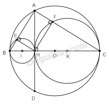 Cho đường tròn (O) đường kính BC. Một dây AD vuông góc với BC tại H. Gọi E, F theo thứ tự là chân các đường vuông góc kẻ từ H đến AB, AC. Gọi (I) và (K) lần lượt là các đường tròn ngoại tiếp các tam giác HBE và HCF.