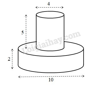 Tương tự, gọi V1, V2 lần lượt là thể tích của hình trụ thứ nhất và hình trụ thứ hai, ta có : \({V_1} = \pi R_1^2{h_1} = \pi {.5^2}.2 = 50\pi \) (đvdt)