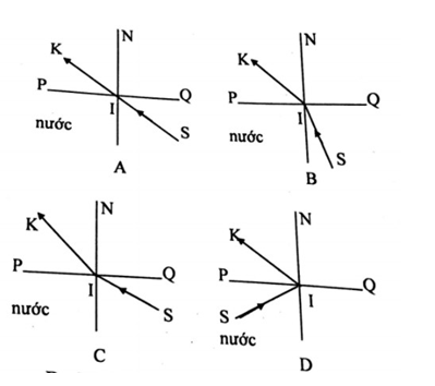 Câu 7: Trong hình vẽ, biết PQ là mặt phẳng phân cách giữa không khí và nước. I là điển tới, IN là pháp tuyến. Hỏi cách vẽ nào biểu diễn đúng hiện tượng khúc xạ tia sáng khi đi từ nước ra không khí