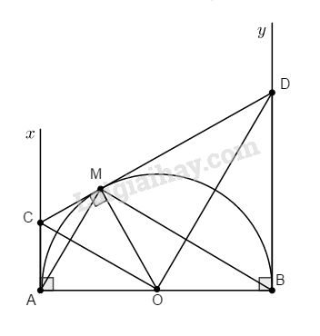 Cho nửa đường tròn (O; R) đường kính AB. Từ điểm M trên nửa đường tròn kẻ tiếp tuyến thứ ba cắt hai tiếp tuyến Ax và By tại C và D.