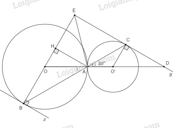 Cho đường tròn (O; 5cm) và (O’; 3cm) tiếp xúc ngoài nhau tại A. Một đường thẳng qua A hợp với OO’ một góc 30˚ cắt (O) tại B và (O’) tại C