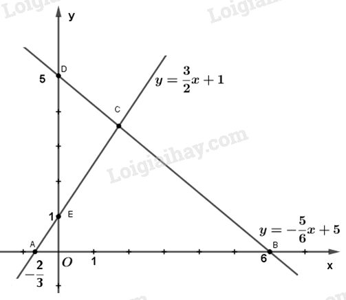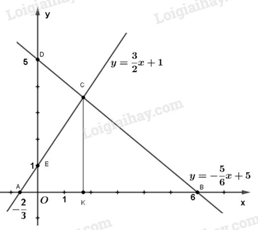 b) Với \(m = 2\) thì ta có hai hàm số là : \(y = \dfrac{3}{2}x + 1{\rm{  }}\left( {{d_1}} \right);{\rm{          y =  – }}\dfrac{5}{6}x + 5{\rm{   (}}{{\rm{d}}_2})\)