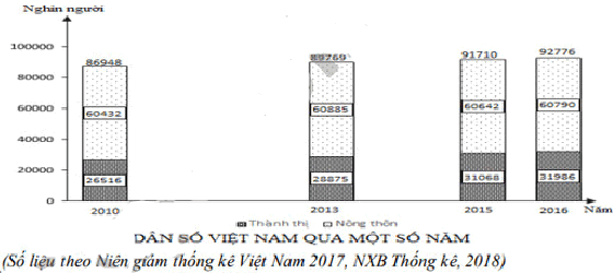 Cho biểu đồ dân số Việt Nam giai đoạn 2010 – 2016, biểu đồ thể hiện nội dung nào sau đây?